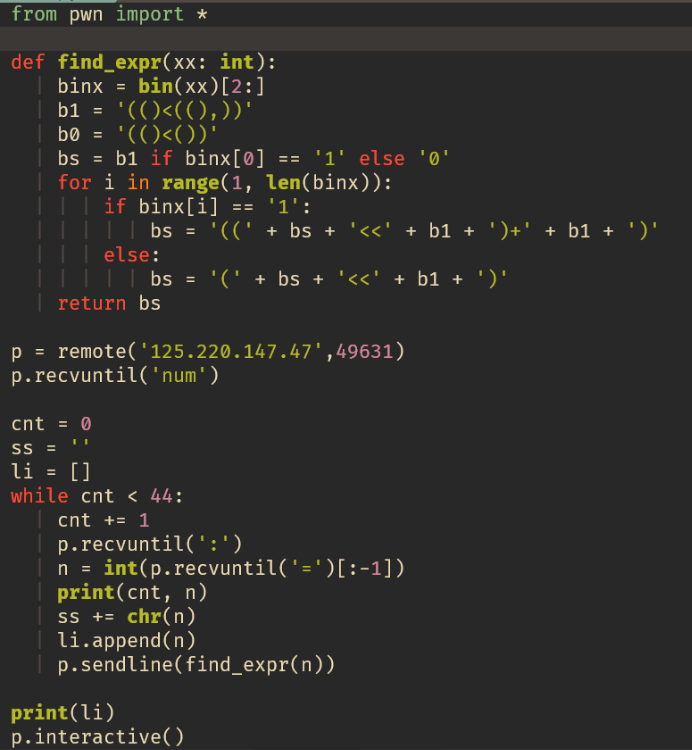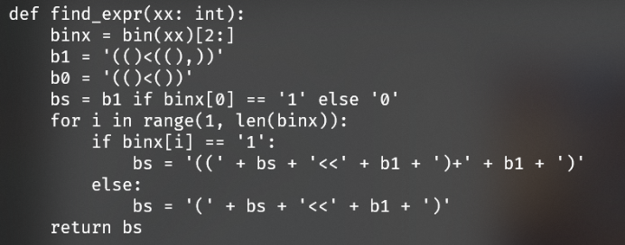 题目告诉我们只能用上面这些字符来构造数字,但其实真正有用的运算符只有(),+<这五个。由于a<a恒为假,考虑构造0=(()<()),1=(()<((),))。然后就是表示得到的数字的二进制咯。因为目前只有<<(左移)可用,所以考虑从高位往低位扫,每新读入一位就往后面移一位,然后视情况加一。